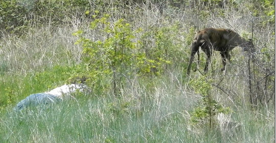 Je repars de l'entreprise par une petite route qui mène à l'embranchement de la route de Fournès. Je vois dans mon champs de vision une énorme bête noire dans le contre-jour, debout, la tête baissée comme un taureau résigné qui attend la mort. C'est Costa à 20m sur une petite route goudronnée qui passe sous la voie ferrée. Je recule, entre dans cette route , je lance des tranches de saucisson par la vitre, Costa avance et mange, je sors et continue à lancer. Une voiture venant de dessous la voie ferrée passe. Costa part dans le fourré. Je m'avance prudemment; elle est là dans l'herbe mais ne peut partir car il y a plein de ronces tout autour. Je lance encore du saucisson. Je retourne à ma voiture :suivre mes conseils : mettre le téléphone , appeler les dames du coin (Catherine d'Uzès, Laurence et Adélaïde d'Avignon avec leurs galgos). Je me badigeonne de liquide D.A.P. et de saucisson. Je marche dans sa diarrhée, pas grave.