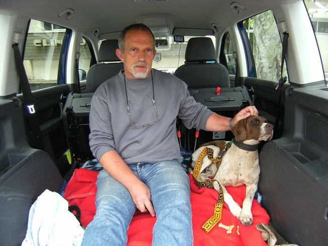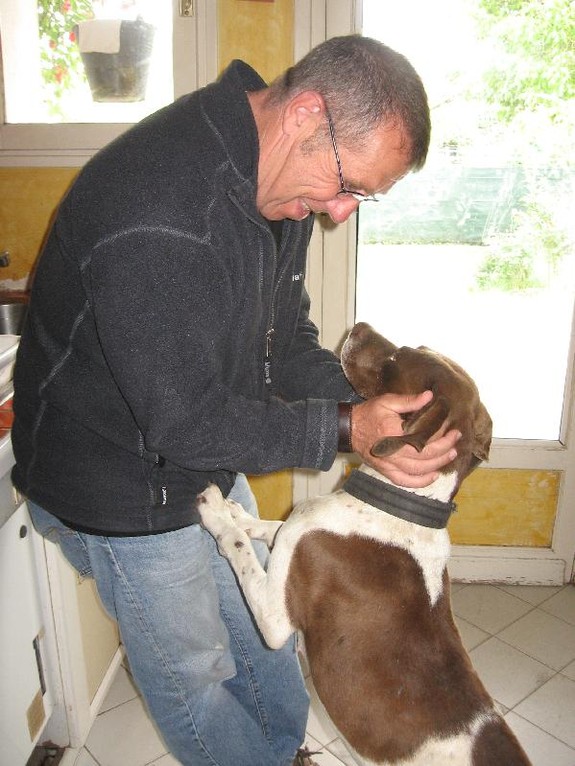Voici notre petit ange, elle doit avoir une sacré étoile au dessus de sa tête !!! arrivée sur place, j'ai de suite foncée en direction de la cage. Je n'étais pas sûre à 100 % que c'était bien elle, sale, recroquevillée sur elle même, un collier et un médaillon que je n'avais jamais vu ... c'était tellement fou et incroyable de la voir enfin, plus un rêve mais bien la réalité, peur d'être déçue une nouvelle fois ... Bruno était comme moi, est-ce vraiment elle ? on avait du mal a y croire. Sur les photos elle paraissait plus grande ... donc direction le véto pour être sûr !!! et ouiiii c'est bien elle, j'avais envie de pleurer, de hurler mais je me suis retenue. mr Laffitte nous a accompagné chez le véto, vous le voyez enfin à côté de Caoba.