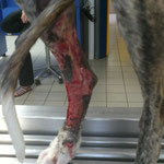 Il lui manque environ 75% de peau sur sa patte arrière. Les soins déjà engagés ont couté près de 800€... Elle devra encore subir une greffe de peau (spécialiste sur Nancy)!