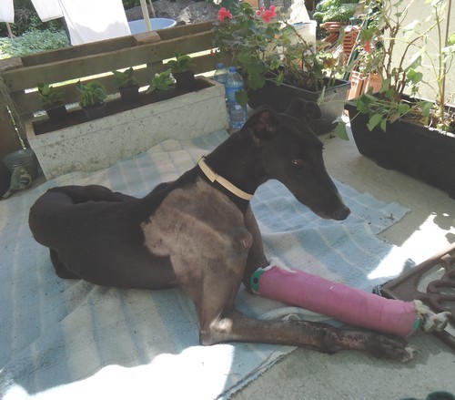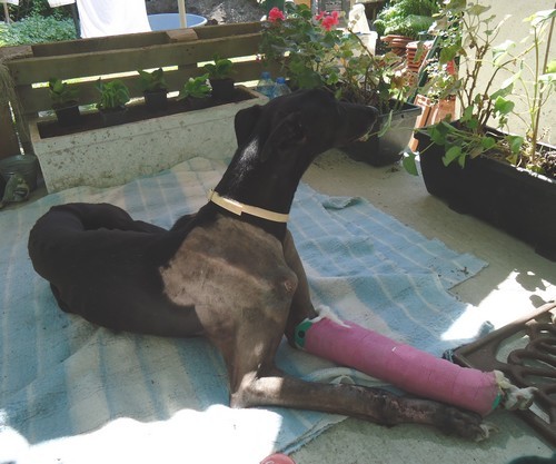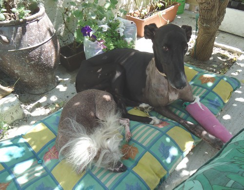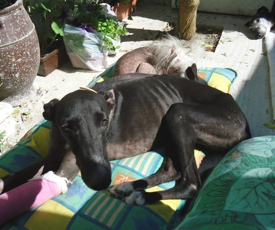 REATA aime prendre le soleil avec ses copains! Elle en profite... C'est une chienne douce et affectueuse. Sa deuxième opération devrait être programmée à la fin du mois... A suivre...