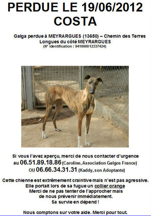 Costa s'est échappée depuis une semaine de chez son adoptante. Un moment d'inattention d'un enfant et la chienne a passé la porte. Elle restait dans la coline à proximité de la maison. Nous ne souhaitions pas que des personnes aillent sur place pour lui faire peur... Son adoptante arrivant à la garder sur place, la cage-trappe devait être posée rapidement... Mais depuis 2 jours elle n'est plus là...