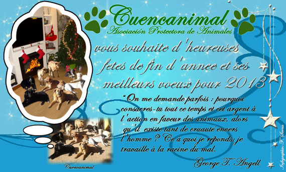 Pourquoi donner de l'argent et tant d'amour à des animaux? parce qu'ils sont les plus humbles et les plus aimants, parcequ'ils sont "ma vie". Que l'année 2013 nous trouve tous pleins de courage , d'attention , de solidarité et que notre regard du coeur ne se détourne jamais. Amitié à tous
