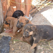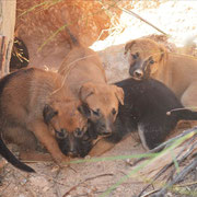Une bénévole est tombée un jour nez à nez avec cinq chiottes. Elles étaient couchées au beau milieu de la route qui traverse ce magnifique paysage de carte postale, qui cache tant de misère animale. Passent sur cette route : tracteurs, voitures de chasseurs bourrés de malheureux podencos étiques et affamés, ainsi que des véhicules de toutes sortes.