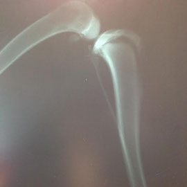 Après examen, il semblerait que le problème se trouve au niveau du genou car il y a douleur à la palpation. Les radios montrent une fracture du plateau tibial, avec un léger déplacement de la tête. Une intervention chirurgicale est recommandée pour poser des broches.