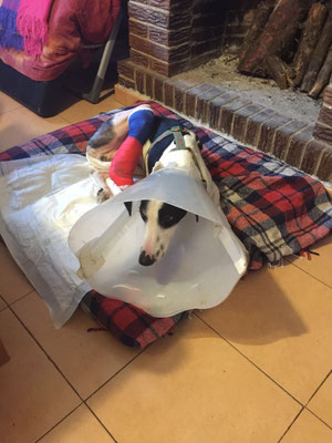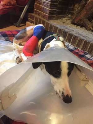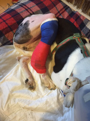 Mais il vient de subir une seconde opération : on lui a retiré tout le matériel métallique et les morceaux d'os en mauvais état. La situation est difficile parce que, pour l'instant, la patte n'a plus de soutien et pend ; de plus, il a une infection. Il a une broche pour lui donner un peu de stabilité mais il faut attendre deux semaines pour voir comment ça évolue et si on peut l'opérer à nouveau.
