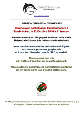 Suite à un appel lancé récemment par le mouvement RICMA (Repulsa Internacional Contra el Maltrato Animal), le collectif allemand www.galgofreunde.com organise le 22 octobre prochain une marche transfrontalière (SARRE–LORRAINE-LUXEMBOURG) contre les maltraitances infligées aux lévriers, podencos et autres chiens.