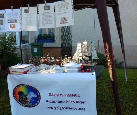 Depuis plusieurs années, Evelyne, notre déléguée Meurthe et Moselle, réserve le bout de trottoir devant chez elle et tout ce qu’elle vend est au profit de Galgos France.