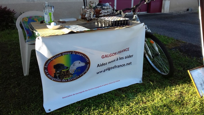 Depuis plusieurs années, Evelyne, notre déléguée Meurthe et Moselle, réserve le bout de trottoir devant chez elle et tout ce qu’elle vend est au profit de Galgos France.