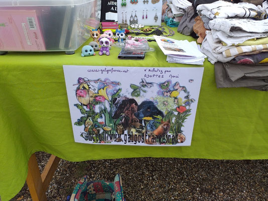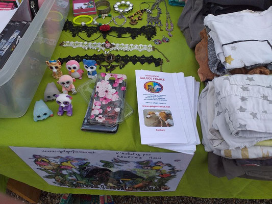 Anaïs a décidé de tenir un stand toute la journée du dimanche, pour y vendre ses objets personnels (bijoux, jouets, jeux, vêtements, etc…) au profit de Galgos France. Elle a aussi distribué des flyers aux passants.