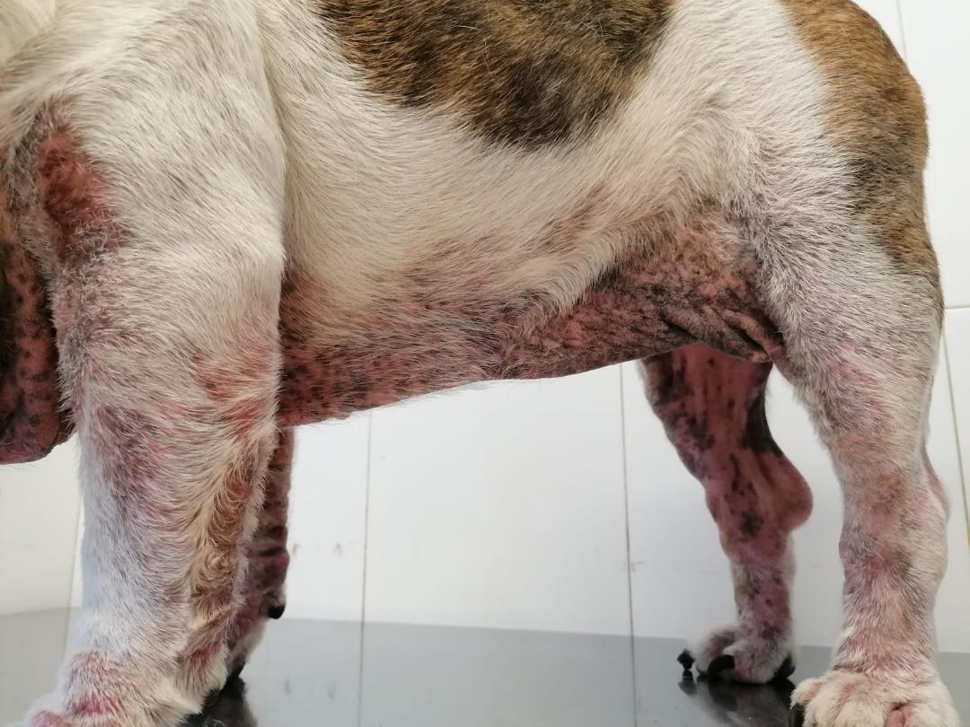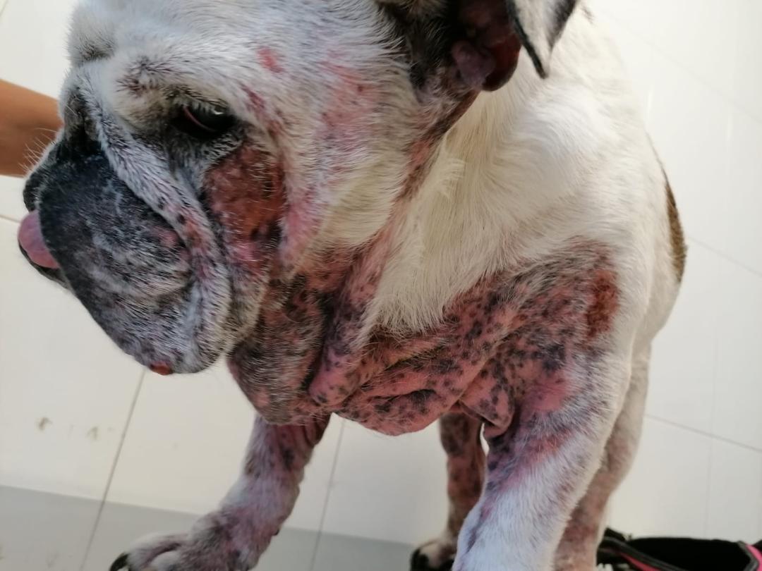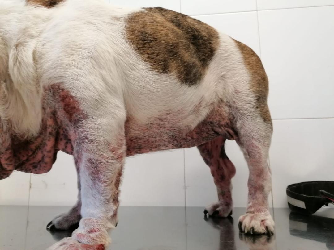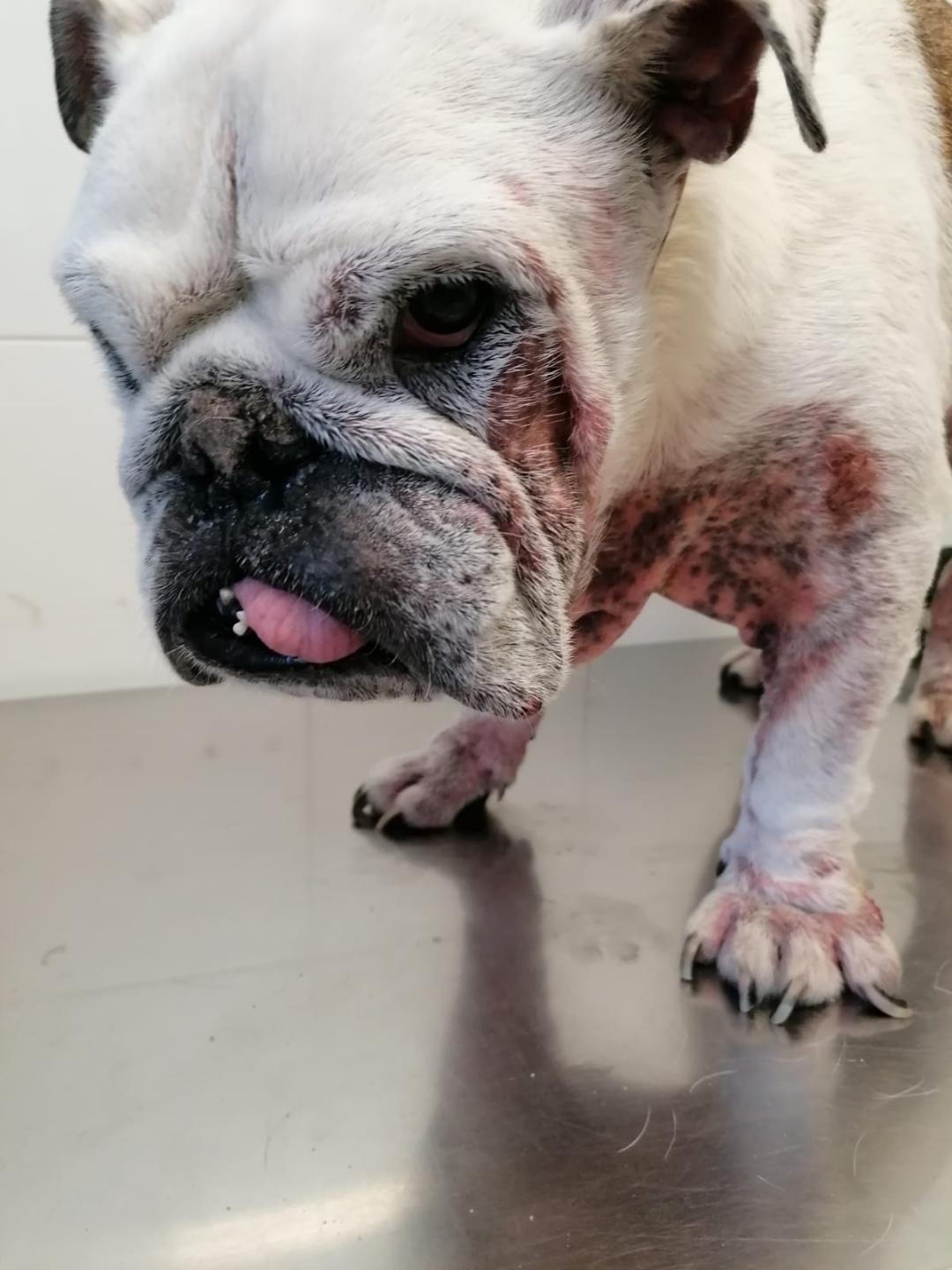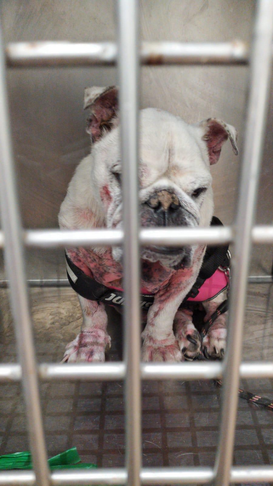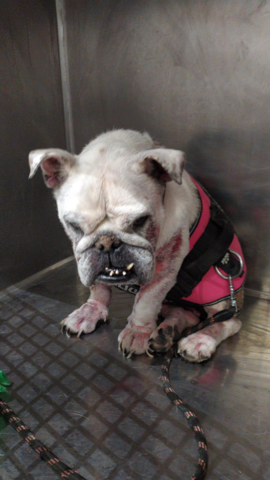 Chérie, bouledogue anglais de 9 ans, Carolina la prend au refuge avant euthanasie, car son propriétaire ne veut pas la soigner à cause d'un problème de peau.