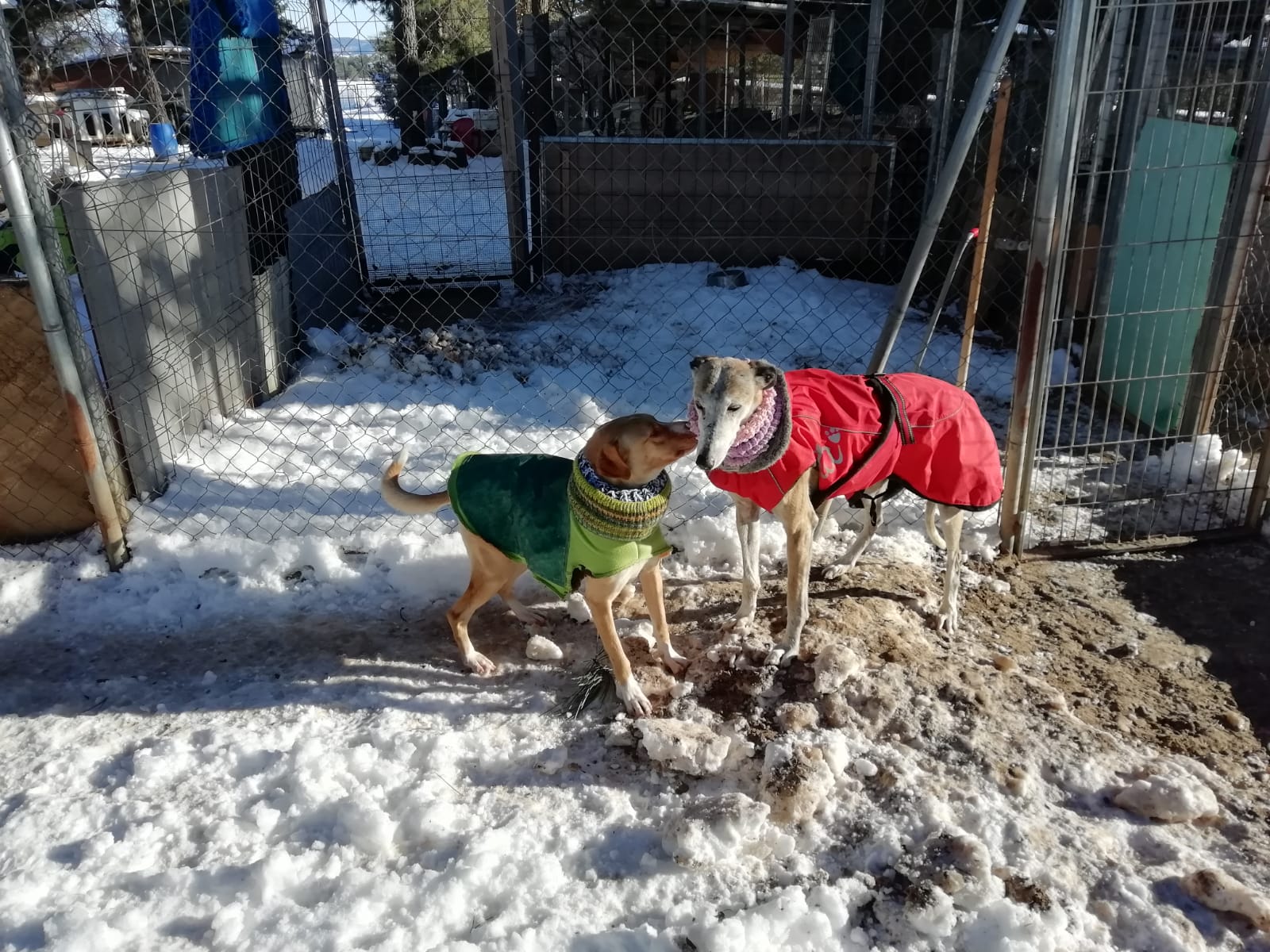 Même si quelques chiens se roulent dans l'épais manteau de neige, la découvrant souvent pour la première fois, la plupart de nos loulous ont froid, très froid ! Les bénévoles les ont tous équipés de manteaux, grâce à de nombreux dons.
