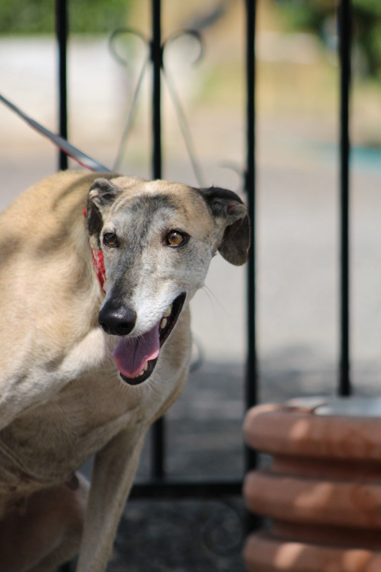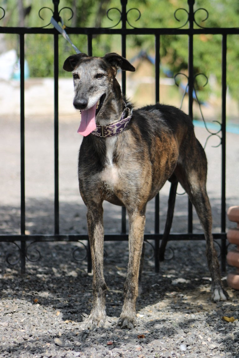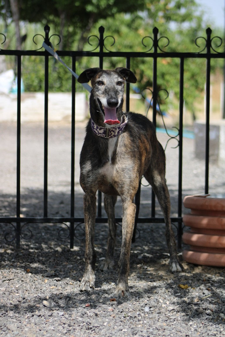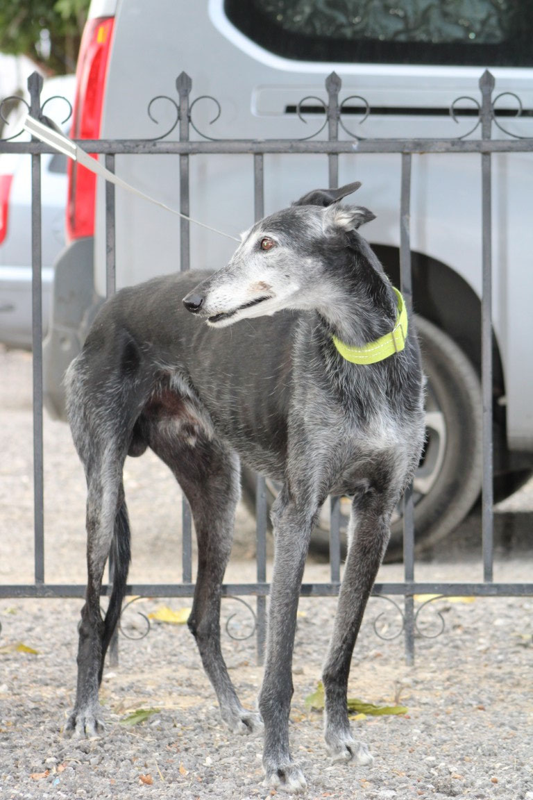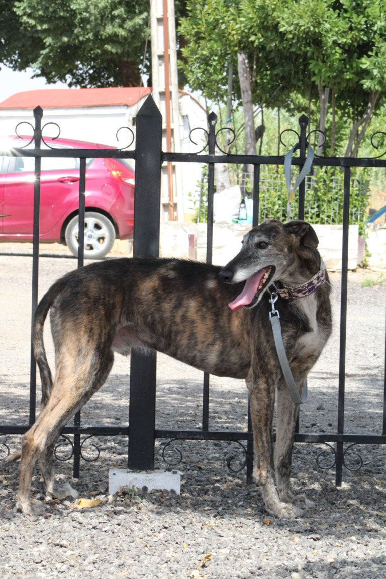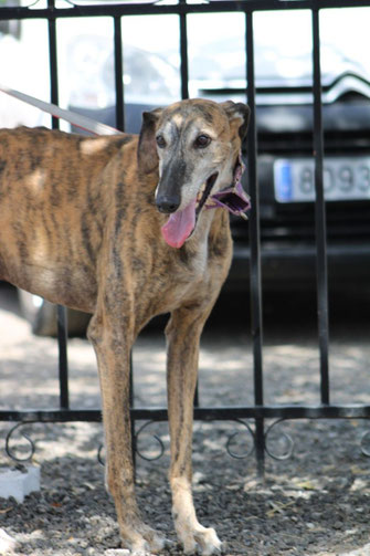 Son histoire : Currito a été cédé par la veuve d'un galguero avec un autre galgo, Romerito. A 8 ans, il n'a jamais connu aucune attention et a toujours dormi dans un chenil...