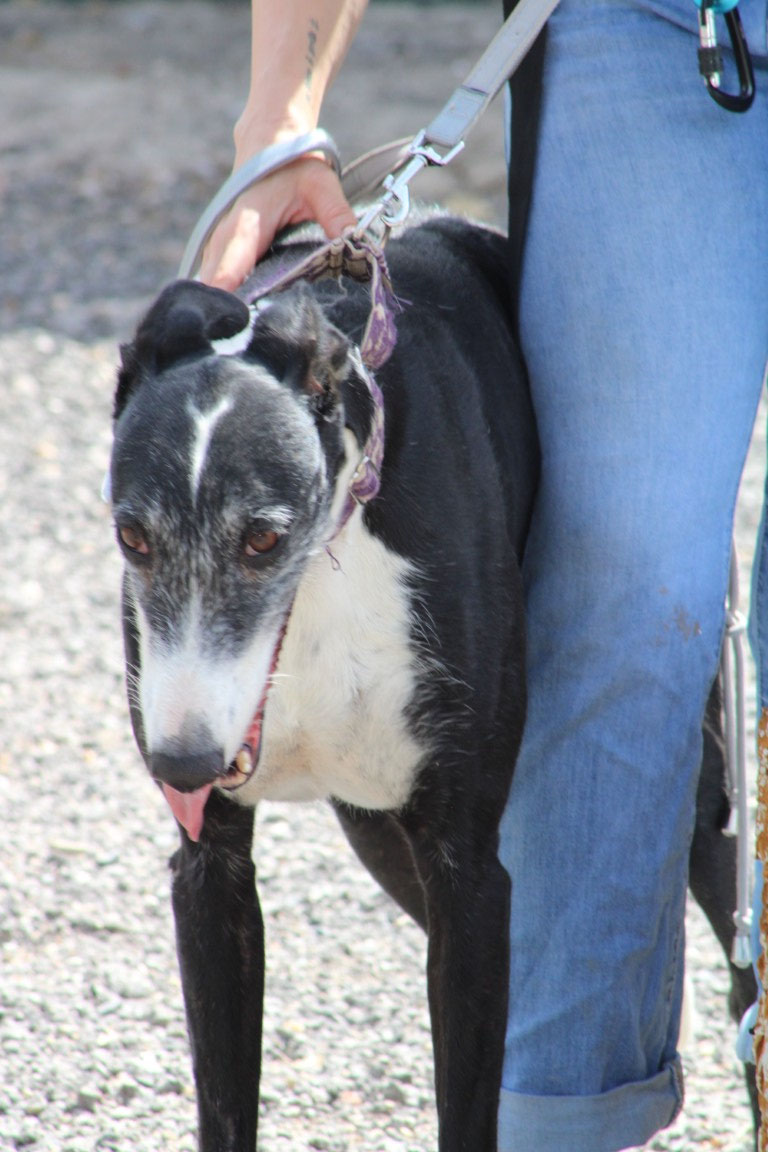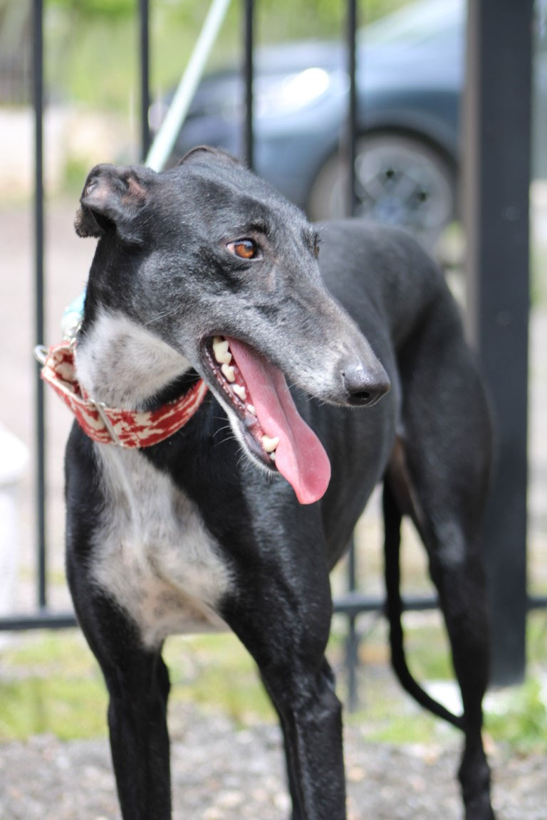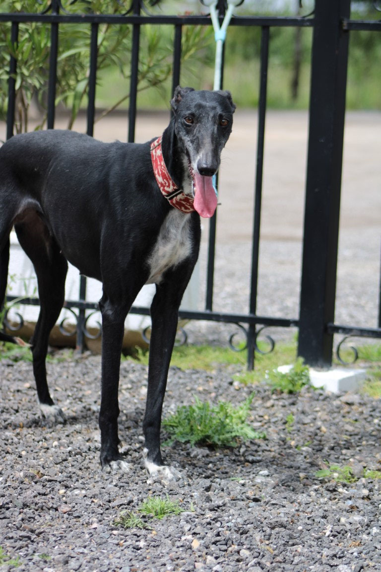 Comportement et sociabilité : Charlotte est une jolie galga noire avec une cravate blanche.