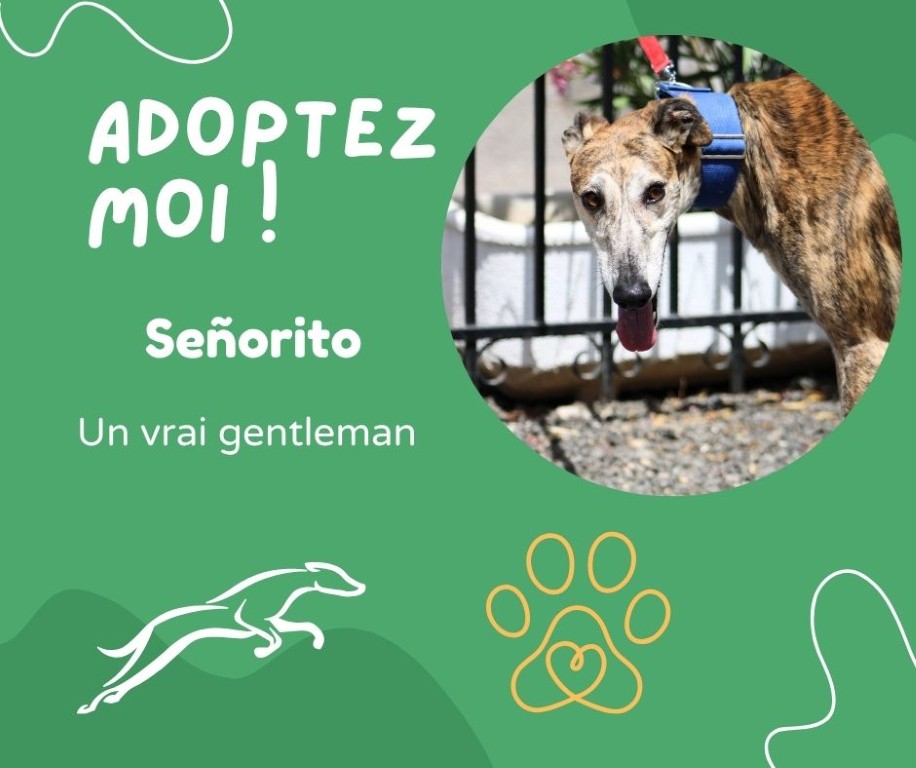 Comportement et sociabilité : Currito est un galgo doux et très timide. Il a un caractère très similaire à son compagnon d'infortune Romerito. Ils n'ont rien connu d'autres qu'une vie en chenil et la chasse. Sans aucun amour. Il supporte assez mal de se retrouver à la pension où l'association garde ses chiens. Currito est habitué à vivre avec des congénères avec lesquels il s'entend sans problème. Il apprécie la compagnie des enfants et se comporte bien tant en promenade qu'en voiture. Il a désormais besoin de trouver une famille qui lui laissera le temps de découvrir une vie qu'il n'a jamais connue et l'accompagnera avec patience vers le chemin du bonheur.