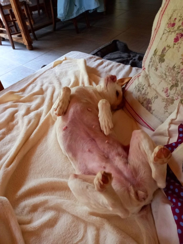 Son histoire : nous ne savons rien de son passé. La mairie nous a contactés pour que nous venions la chercher. Elle était très maigre et présentait de nombreux signes de négligence.