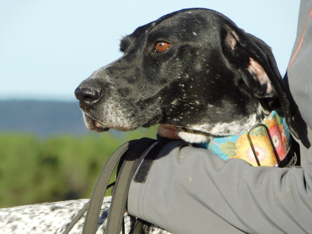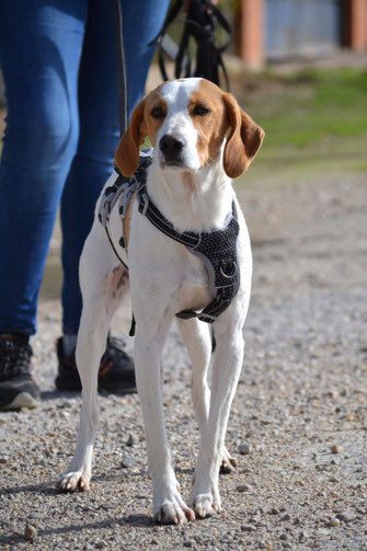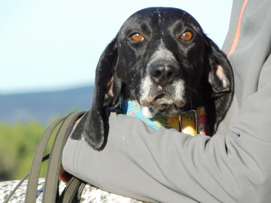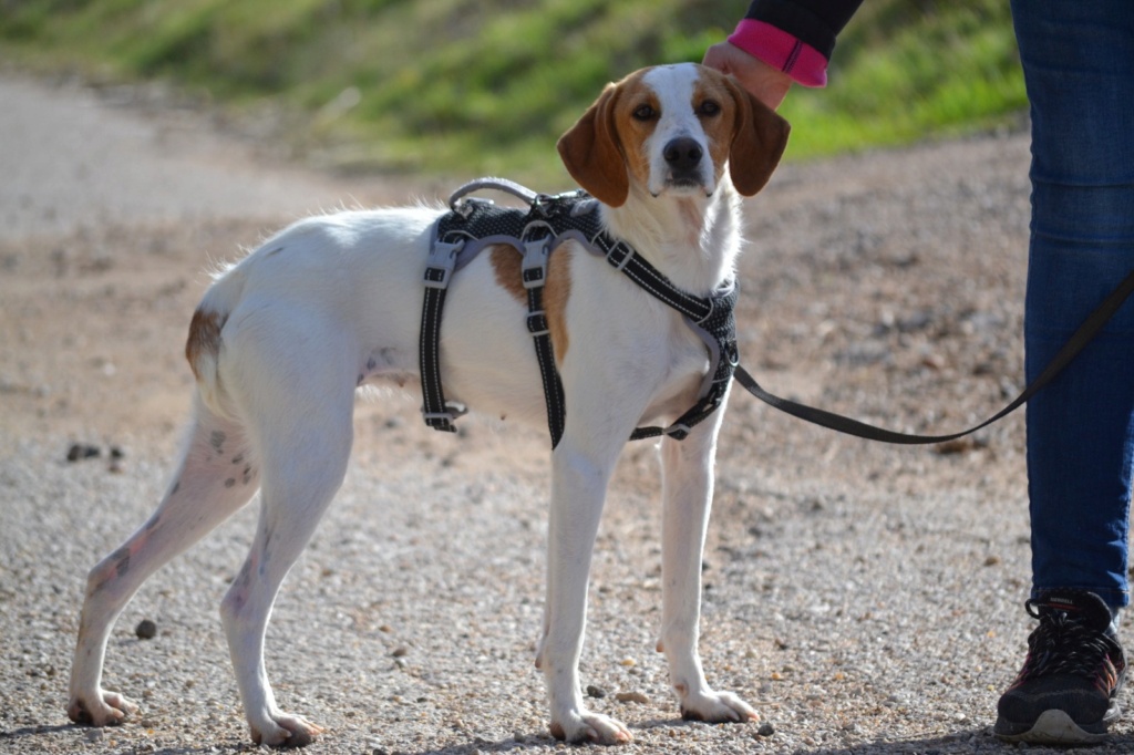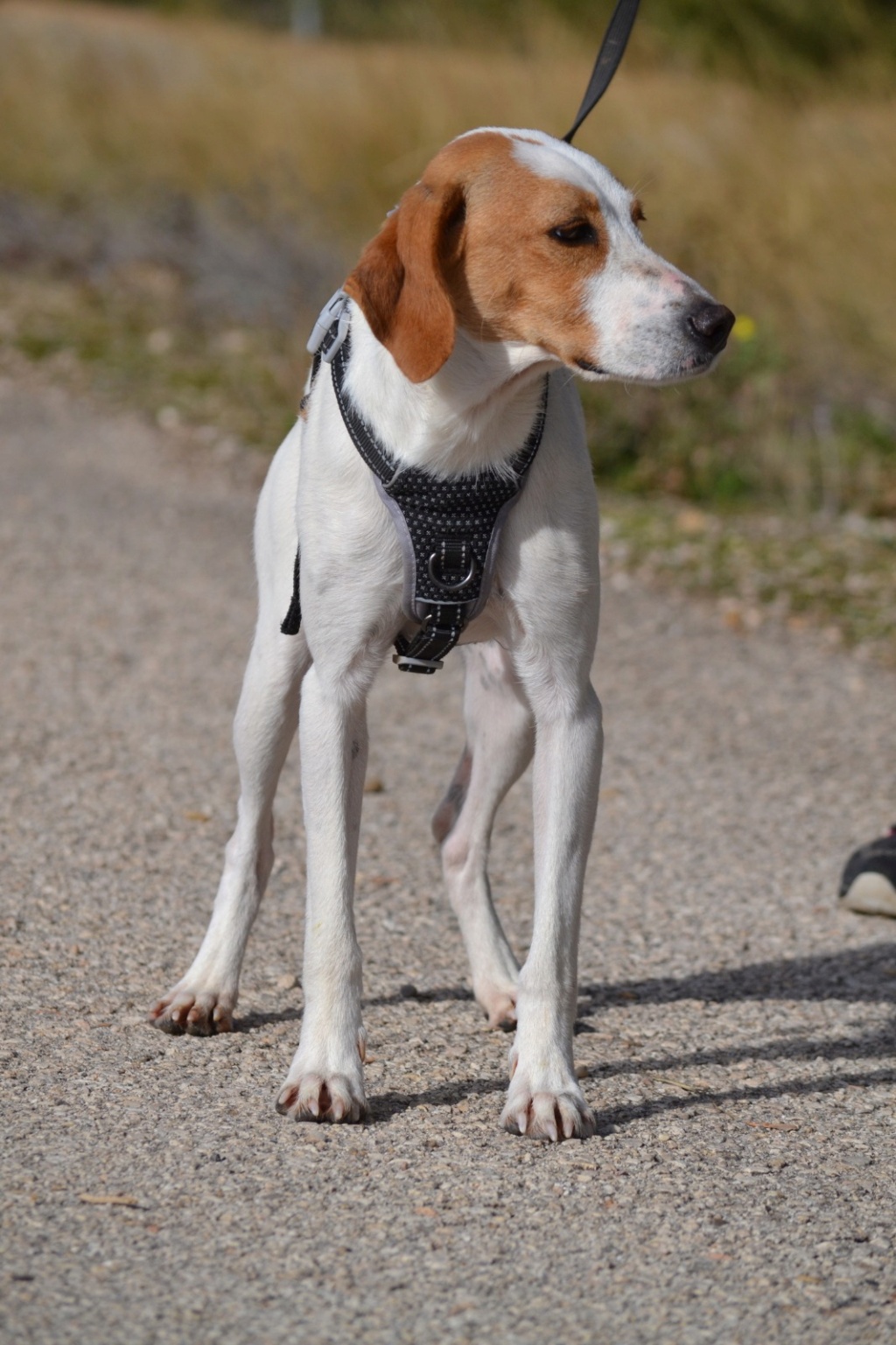 Son histoire : un autre vieux chien de chasse qui apparait, abandonné, dans un village. Quand la puce a été vérifiée, ses propriétaires n’en voulaient plus et nous l’ont donnée... Cela ne va-t-il jamais s'arrêter ?