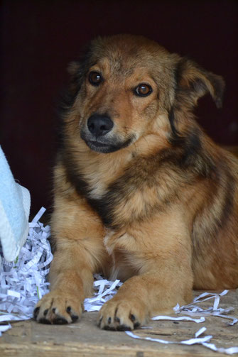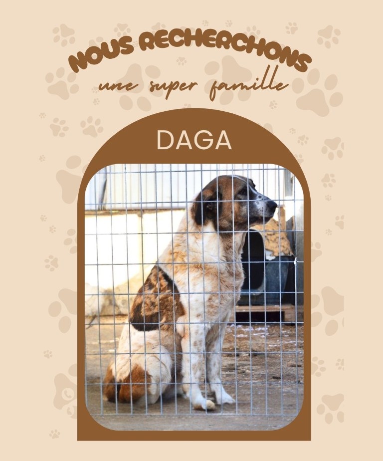 Son histoire : nous avons été appelés pour récupérer Daga dans un village et nous n'en savons pas davantage. Elle est arrivée sale et dénutrie, apeurée. Grâce à notre amour et de la patience, Daga s’est peu à peu adaptée et à présent Daga est très sociable avec les personnes comme avec les chiens.