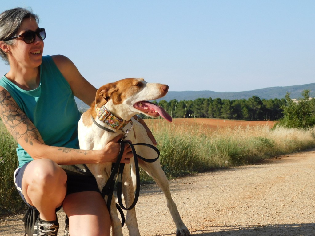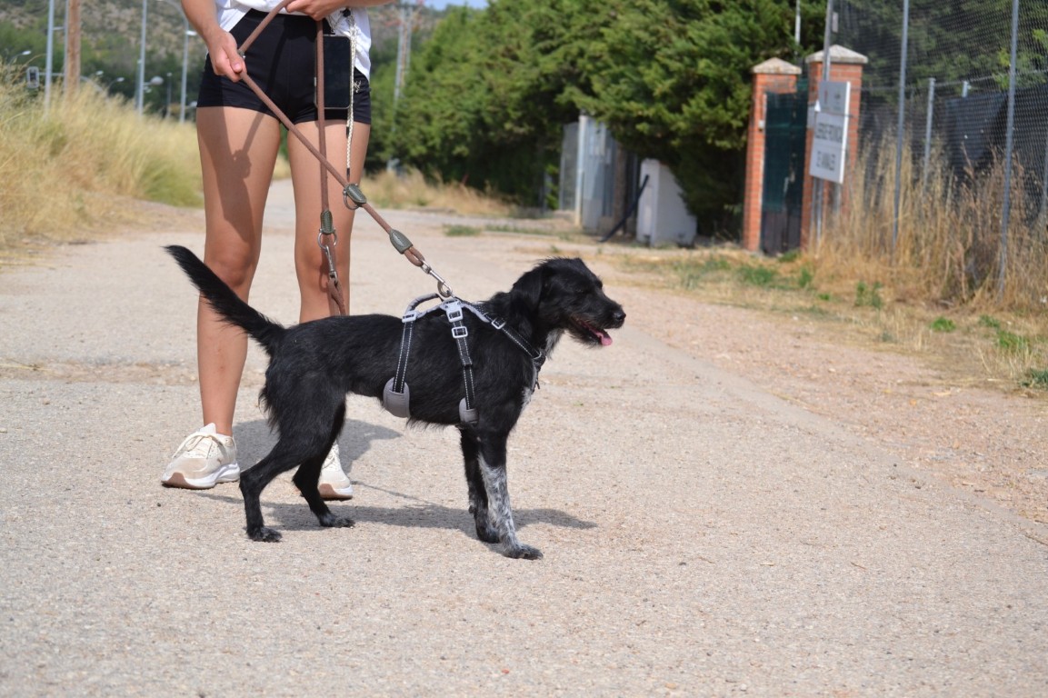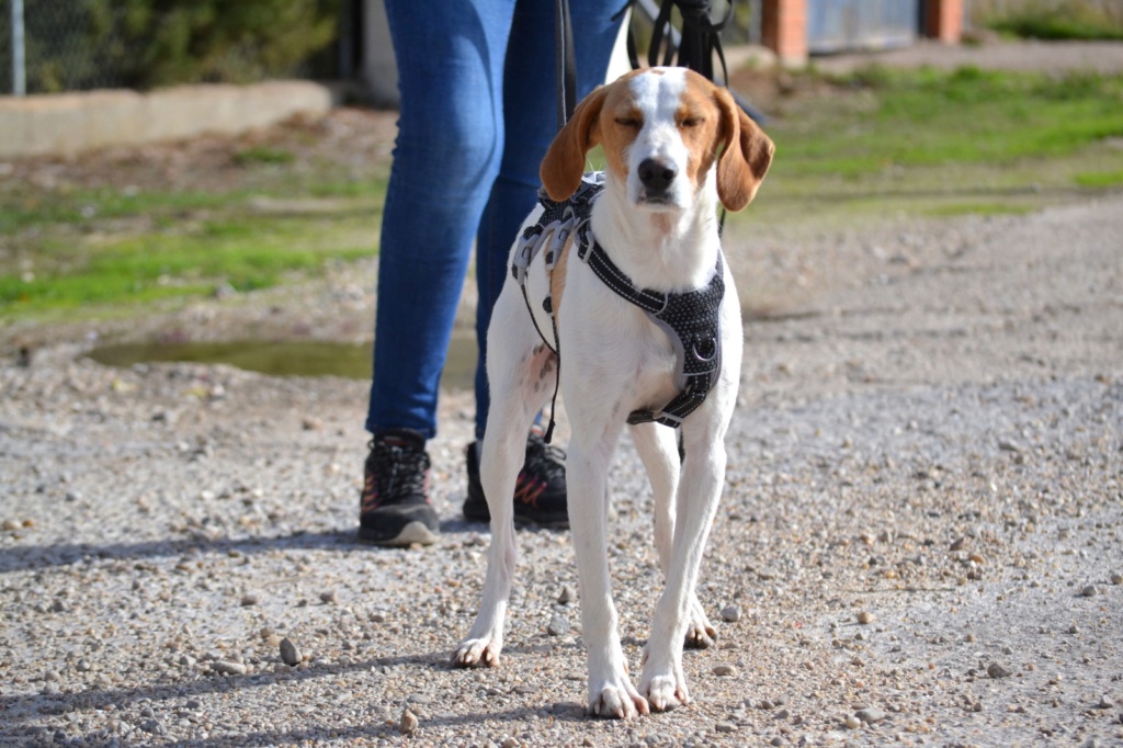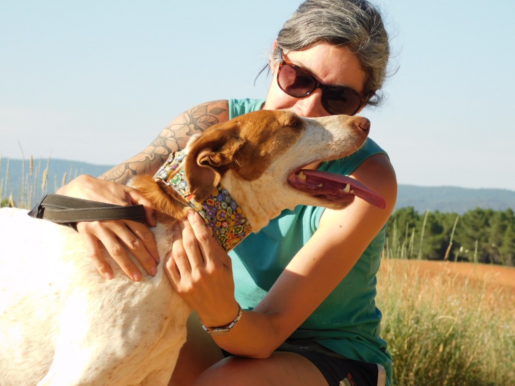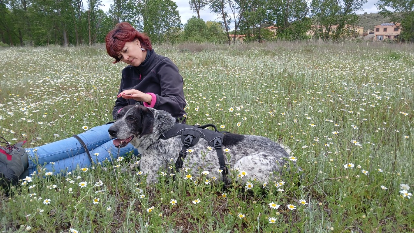 Ce manque de stimulation l'affecte : elle est plus nerveuse que d'habitude, gémissant pour attirer l'attention et avoir de la compagnie, et sa sensibilité est exacerbée par cet espace confiné. Il est clair que son âme tourmentée aspire à une autre vie, une vie plus riche. Mais le plus beau, c'est que lorsqu'elle quitte le refuge, lorsqu'elle respire l'air frais et qu'elle se sent libérée de cette routine angoissante. Tálon, alors, se métamorphose. Elle se détend, se stabilise, son regard s'adoucit. Dans les quartiers calmes de la ville, elle marche bien, même si elle est sensible aux bruits. Elle ne panique pas et n'essaie pas de s'enfuir, elle a simplement besoin de s'habituer à son nouvel environnement. Et elle s'y habituera, il lui faut juste un peu de temps, du calme et de l'affection. Elle voyage bien en voiture, elle y monte d'elle-même et voyage tranquillement dans sa cage de transport. Elle se laisse aussi bien soigner par le vétérinaire, elle est un peu agitée, certes, mais si on lui parle doucement et qu'on la caresse, elle se concentre sur nos mains et se laisse faire sans problème. C'est à la campagne qu'elle révèle toute sa véritable nature : là, son nez ne cesse de renifler, d'explorer, de découvrir chaque recoin comme si le monde était un livre ouvert rempli d'histoires à lire et surtout sentir. Elle a l'air heureuse, sereine, en harmonie avec elle-même. C'est un vrai bonheur de la voir ainsi s'épanouir.