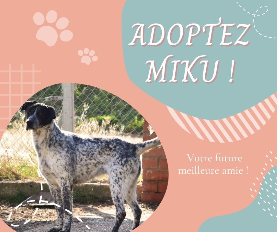 Son histoire : Miku a été abandonnée en fin de saison de chasse une fois la saison terminée, comme beaucoup d’autres chiens de chasse. Miku est arrivée avec beaucoup de peur mais grâce à son compagnon de chenil, elle a pris confiance. A présent, elle est une chienne super sympa qui mérite d’avoir sa chance et une super famille.