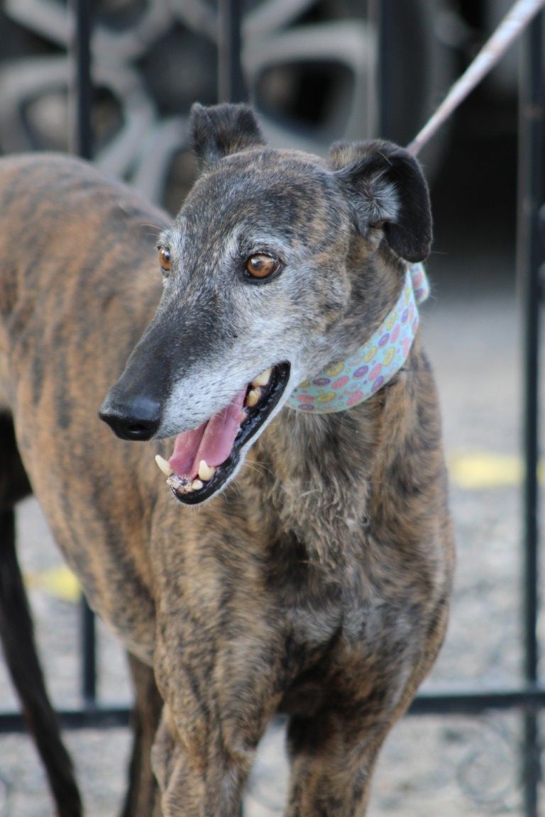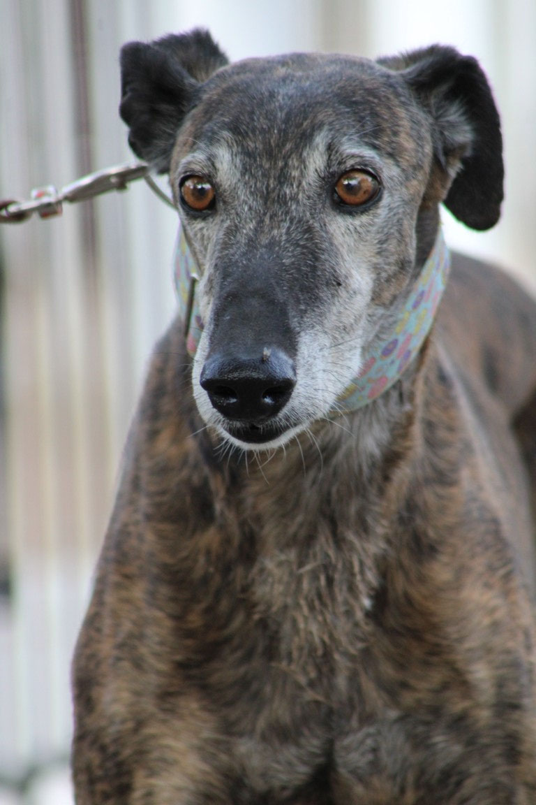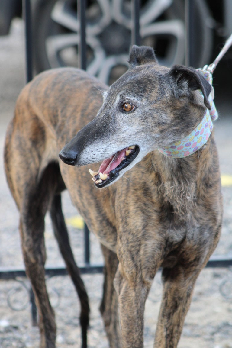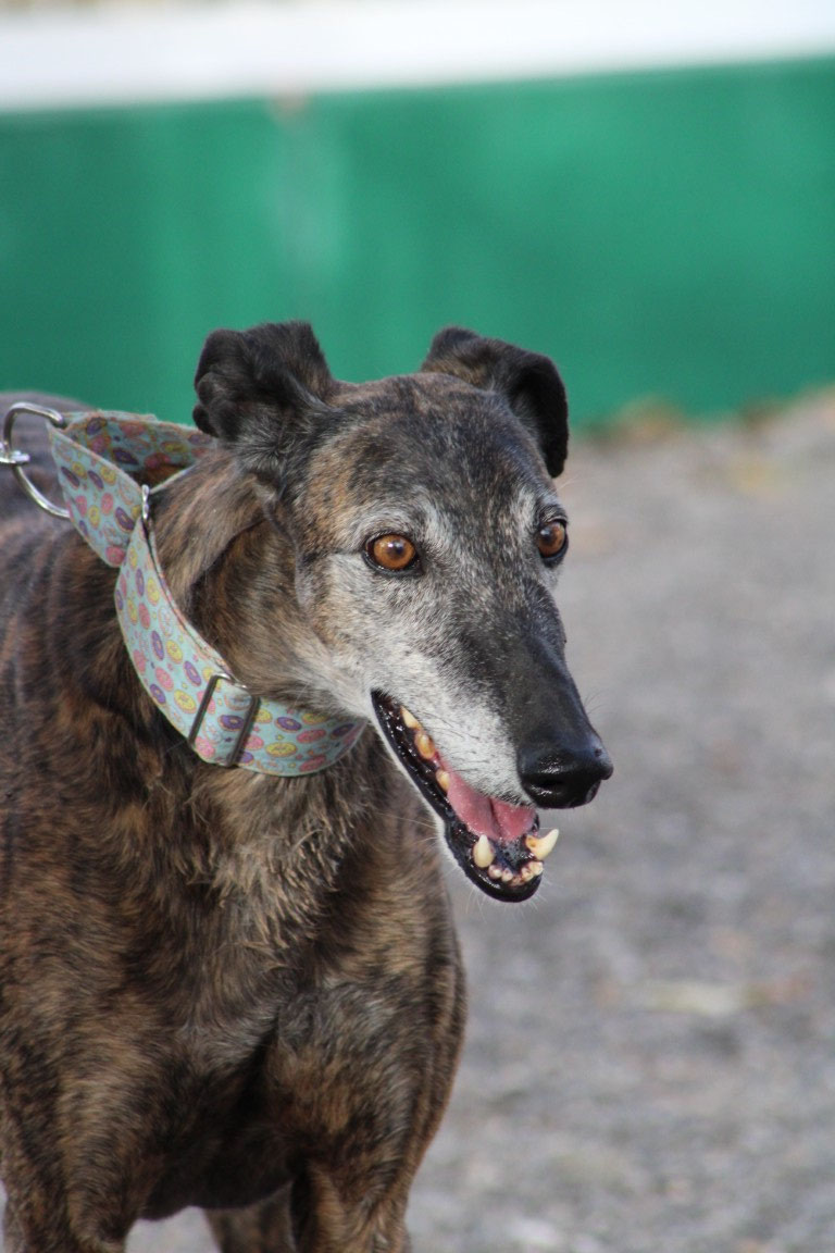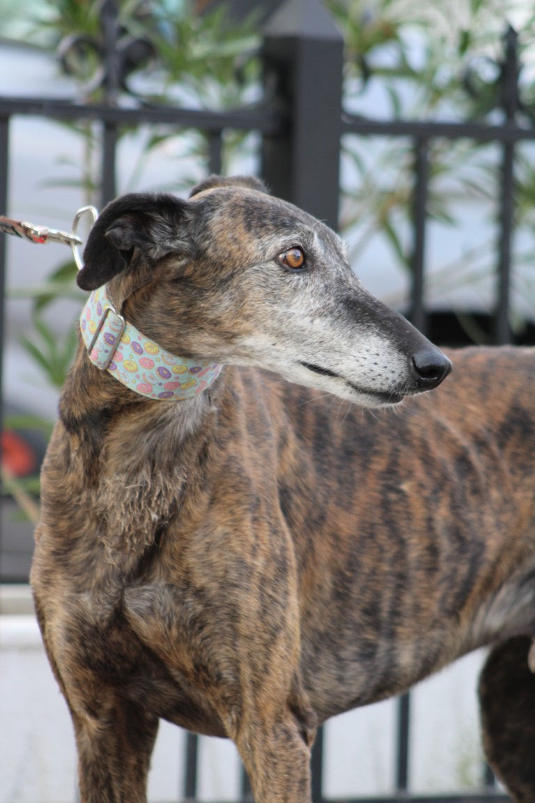 Son histoire : Versace n'est pas né en Espagne mais en Irlande. Il est arrivé pour une seule mission : courir ! Et tant qu'il performait sur les champs de course de lévriers, tout allait bien. Mais un jour, il s'est blessé à la patte et a cessé d'être rentable. Il est alors passé au yeux de son maître du statut de champion des pistes à celui de vieux tacot. A seulement 3 ans... L'association Miranos a los Ojos l'a donc pris en charge pour lui offrir une nouvelle vie.