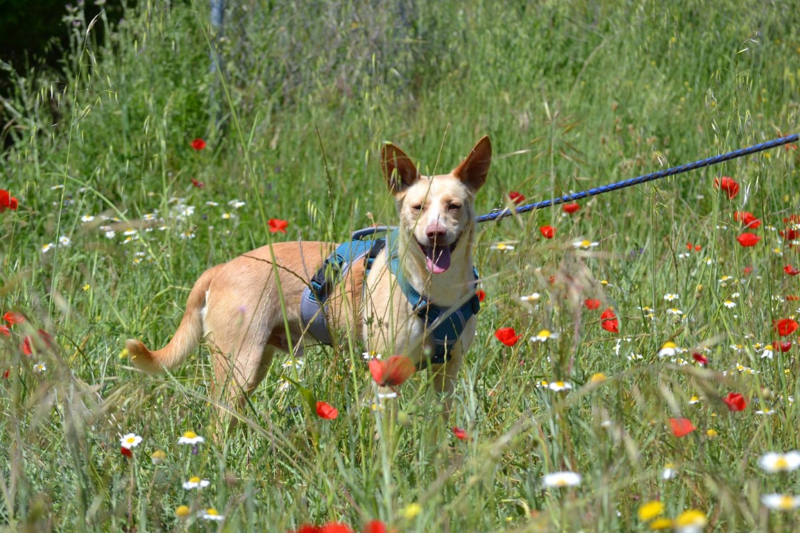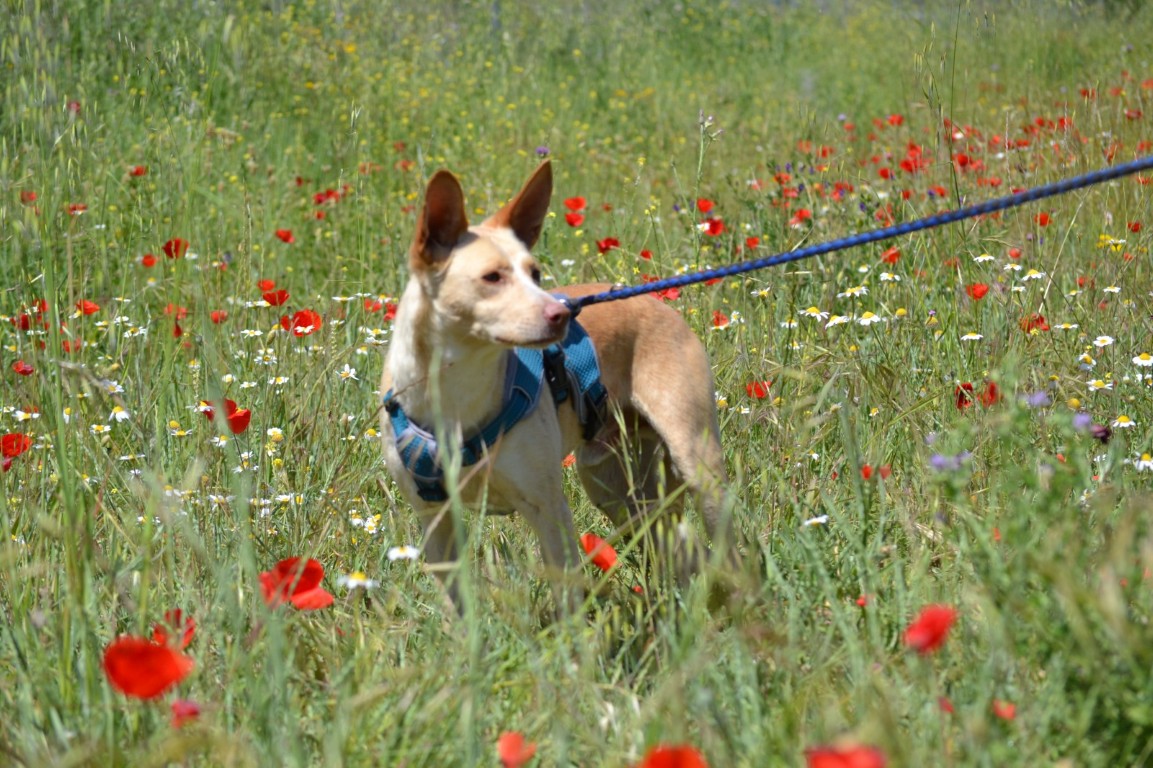 Comportement et sociabilité : si le bonheur avait un visage de chien, ce serait Colibrí ! Ce jeune petit podenco est un vrai petit ange : incroyablement affectueux, amical et très charmant ! On dirait qu'il sourit tout le temps (un sourire contagieux, en effet), la queue toujours en mouvement, et son enthousiasme illumine la journée de tous. Jeune et plein de vie, il a besoin d'une famille prête à suivre son rythme de vie joyeux. À seulement un an, il mérite la meilleure des familles, nous ne voulons pas qu'il reste trop longtemps en refuge. Nous l'aimons de tout notre cœur. C'est formidable de voir comment il intègre les autres chiens dans ses activités, sans aucun problème d'entente. Colibrí adore tout le monde (humains, chiens, tous ceux qu'il rencontre) et son énergie est une véritable source de joie au quotidien. Il adore courir, jouer, faire des cabrioles et distribuer des bisous. Il a même rencontré un chat calme et sa réaction n'a pas été désagréable.