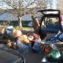 Vendredi 8h, le ciel est d'un bleu pur... il fait -5°. C'est l'heure du déchargement des divers dons venus de France, de la nourriture, des couvertures et des manteau réalisés en tricot ou en
