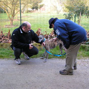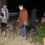 Les galgos sont là, qui nous attendent... un gros travail s'accompli encore par les bénévoles, trouver les chiens à emmener, leur mettre un collier adéquat parmis ceux que nous emmenons, remettre