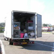 Corinne prend le volant pour débuter le trajet. Notre camion est encore bien rempli des dons divers que nous avons collecté pour le refuge, nourriture, produits désinfectants, un pulverisateur