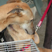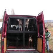 pas le temps de trainer, il faut charger les chiens....Christine de Adaana est là avec ses petits : Brisa, Lisy, Kelma, et les bénévoles d'Asoka venus d'Alicante avec les podencas Hanna et Fiona. Marta de Amalos arrive aussi avec Pascual, Nuria, Rania et Pillo. Bloo de la Guarida et Eowin sont arrivés de Cordoba déja le matin, ainsi que Pitufa de Jaen qui est restée chez Mercedes depuis la veille.