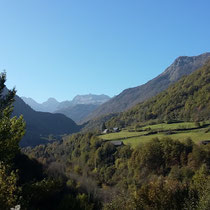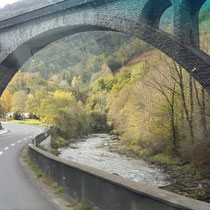 Le temps étant au beau fixe, nous décidons de ne pas passer par Bayonne et Irun pour traverser la frontière mais de passer plus à l’est, au Col du Somport. Moins de kilomètres et surtout pas de péage mais route que nous ne pouvons pas emprunter en hiver à cause de la neige, ni bien sûr au retour de notre périple lorsque nous avons des chiens à l’arrière. (ça tourne un peu quand même !). Le ciel s’éclaircit au moment où nous approchons des Pyrénées et nous profitons ainsi de paysages splendides ! Puis c’est l’Espagne qui déroule ses mornes plaines arides parsemées d’immenses fermes porcines…